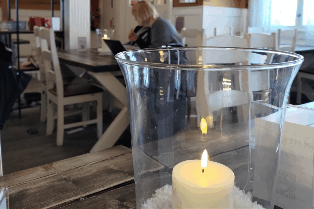 (オウルの朝9時。外は明るいのに、ホテルのレストランでは照明を落としてキャンドルを灯します。)